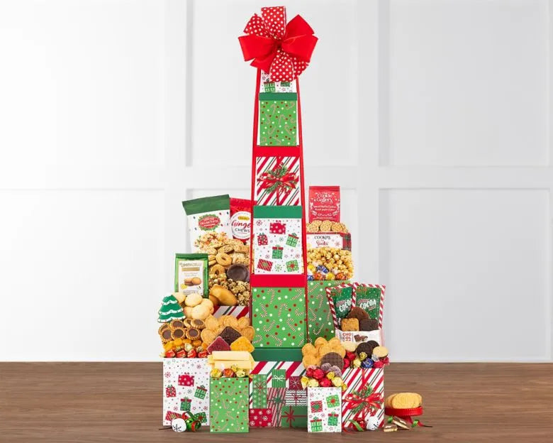 This colossal holiday tower includes festive box after box of chocolate and sweets. Milk and dark chocolate hazelnut pralines, coconut cookies, ginger chews, Hammond's dark chocolate cookie bar, Lindt milk, white and dark chocolate truffles, brownies, toffee popcorn, almond biscotti, spiced waffle cookies, lemon, raspberry and cookie butter cakes, a decorated vanilla Christmas tree cookie, hot cocoa and much more fill these six holiday gift boxes. Gift Size: 6" x 6" x 39" Item 501